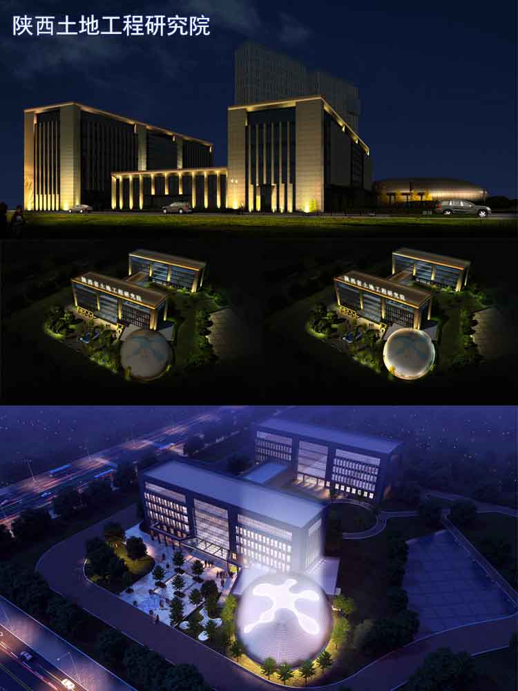 陜西土地工程研究院是承擔(dān)各類建設(shè)工程勘察、設(shè)計、土建、安裝、市政、石化、公路、地鐵、機場、礦山、核電、裝飾、鋼結(jié)構(gòu)、古建園林工程施工。對于設(shè)計院辦公樓體亮化設(shè)計,公司設(shè)計師跟根其前后樓體的建筑和廣場的球狀建筑的特點,采用簡單的洗墻燈和投光燈來進行效果設(shè)計,彰顯建筑的大氣與威嚴。